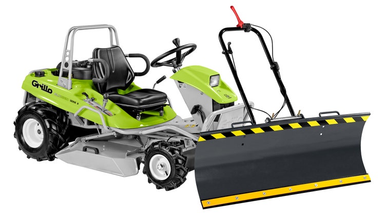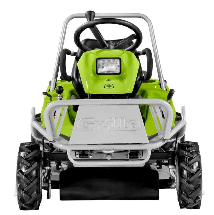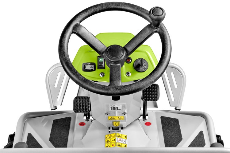 1-Messer-Mähdeck mit Heck- und Seitenauswurf. Parkbremse. Hydrostatischer Fahrantrieb regelbar über Handhebel, Komfort-Fahrersitz, Rammschutz vorne, Arbeitsscheinwerfer.